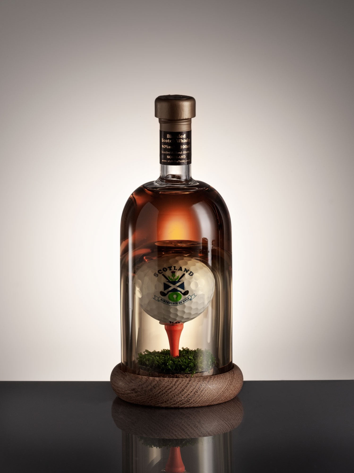 Celebrate two of Scotland’s most famous inventions – whisky and golf – with this mini glass whisky decanter featuring a Scotland logo golf ball on a tee. The decanter is beautifully presented on a solid oak base and comes filled with 10cl of Blended Scotch Whisky. Both whisky and golf were born in Scotland, and this refillable decanter celebrates that in style. It is designed and distributed from the heart of Scotland, and the golf ball is branded with a logo that celebrates Scotland’s position as the home of golf. Alternatively, you can use your own personal golf ball in the design instead. Please contact us in plenty of time, for more information. The mini golf ball and tee whisky decanter is a great gift idea for all special occasions, including corporate events, prize-givings, anniversaries and celebrations. If someone in your life loves Scotland, whisky, golf, or all of the above, then this could be the perfect present for them.